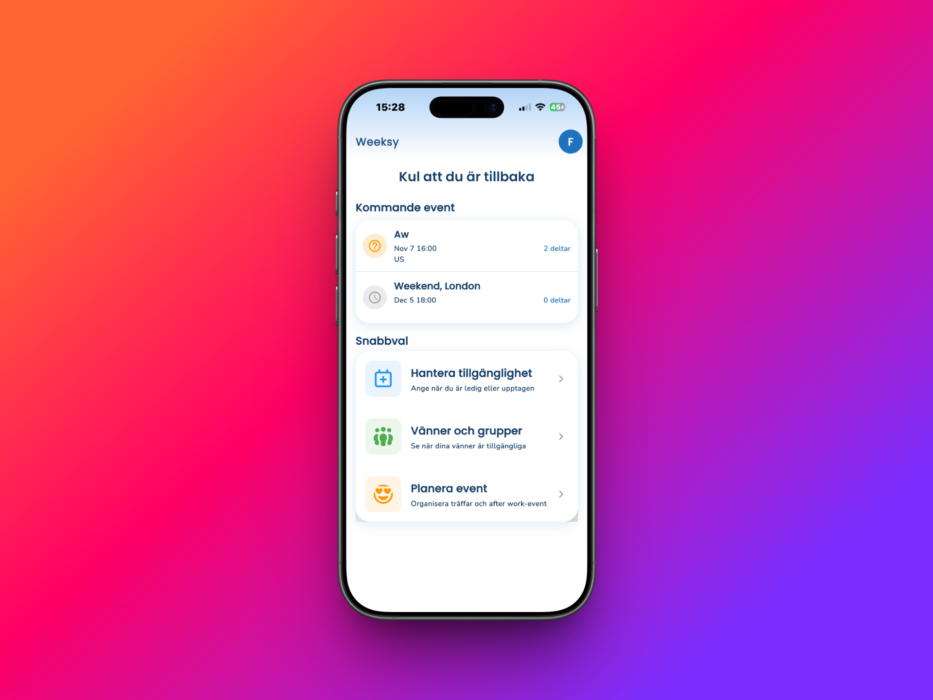 Jag använder Weeksy både privat och för mitt nätverk. Gillar verkligen hur appen visar när folk är tillgängliga, och att varje event har en egen chatt. Känns modernt och genomtänkt!